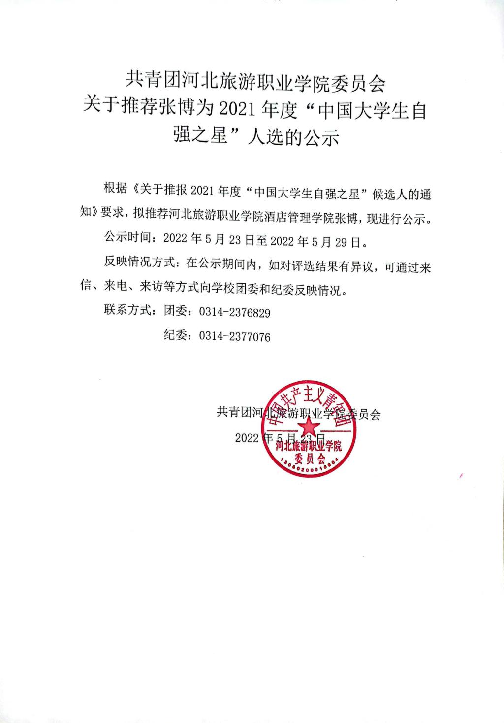 共青团河北旅游职业学院委员会 关于推荐张博为2021年度“中国大学生自强之星”人选的公示