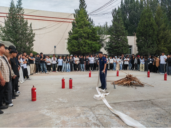学校邀请驻地消防救援大队针对预防学校火灾注意事项、常用消防器材正确使用方法等方面普及消防安全知识,并以宿舍楼为场景,以二级学院为单位开展了七场次消防安全疏散演练活动。在消防安全培训场上,消防救援人员结合新生日常学习生活的重点区域,详细讲解了火灾的成因、扑救方法、逃生技巧以及日常消防安全注意事项等常识。培训过程中设置了互动问答环节,消防救援人员针对校园消防安全重点问题现场提问,邀请学生代表作答。理论讲解结束后,在消防工作人员的指导下,新生们完成了灭火器、消火栓的实操训练,切实掌握了使用方法,并参与了消防疏散演练。