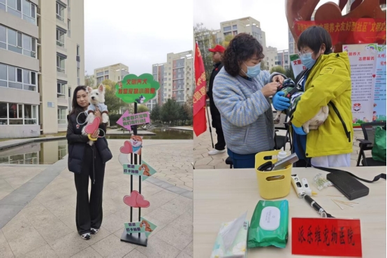 活动现场,畜牧兽医学院的志愿者们早早搭建起服务展台,设置了宠物义诊区。在宣传区,志愿者们悬挂“文明养犬友好型社区”文明实践志愿服务活动的横幅、发放宣传手册,向居民详细解读《承德市养犬管理条例》,使居民深刻认识到不文明养犬的危害。免费服务区人头攒动,社区宠物主人纷纷前来打卡,带领自家宠物接受检查,并深入了解文明养犬志愿活动的主要内容。世纪城社区工作人员邢璇表示,“这次宠物义诊活动,是为辖区内的养宠家庭和宠物,提供身体健康检查与检测服务。我们希望通过本次活动,提高辖区居民的文明养犬意识,助力‘文明养犬友好型社区’的创建。”