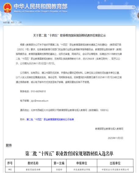 近日,教育部发布《关于第二批“十四五”职业教育国家规划教材遴选结果的公示》,在各省级教育行政部门和全国行业职业教育教学指导委员会、教育部职业院校教学(教育)指导委员会、教育部直属高校推荐的基础上,经形式审查、网络评议、会议评议等程序,全国范围内共有2966部教材入选。畜牧兽医学院教师任俊玲主编的《兽医实验室诊断》教材成功入选公示名单。这是继该教材2024年入选河北省“十四五”职业教育规划教材后,畜牧兽医学院在专业教材建设方面取得的又一重要突破,为动物医学专业人才培养与行业发展提供了优质教学资源支撑,为后续教材建设提供了宝贵经验。