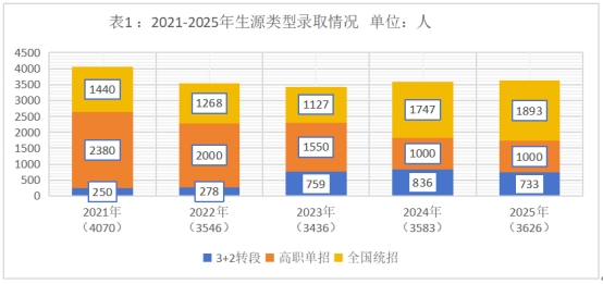 生源状况平稳,规模与结构双重保障。我校通过专业内涵建设与行业需求精准对接、多元培养渠道与不同群体入学需求适配,达成生源规模与结构的双重保障。生源数量保持稳定(见表1),充分体现社会对学校办学质量的高度认可。生源结构持续优化,布局更趋合理,省内生源占比稳定在约85%(见表2),省外生源覆盖全国23个省份(如辽宁、山西、河南、内蒙古等),区域结构进一步均衡,与学校服务区域经济、辐射全国行业需求的办学定位相契合。文科、理科、艺术类生源比例协调,与学校专业设置需求相匹配,为差异化人才培养提供精准支撑。普通高考招生、高职单招、中高职贯通等招生类型相互补充,满足不同群体入学需求,为学校分层分类人才培养体系的构建奠定了坚实的生源基础。