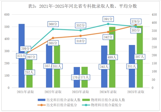 录取成绩逐年提高,生源质量显著改善。学校凭借“双立双成”育人模式的深入推进与落实,在专业建设、实践教学、就业升学等人才培养领域的成效持续彰显,学生在职业技能大赛中屡获殊荣。这些切实的培养成果获得了家长和考生的广泛赞誉,报考热度持续高涨,直接促使录取成绩逐年上涨:河北省内专科批历史科目组录取平均分从2021年的207分提升至2025年376分,河北省专科批物理科目组录取平均分从2021年的209分提升至2025年383分(见表3)。2025年,河北宠物医疗技术专业在河北省专科批物理科目组的最高分达到476分(超出本科线17分);学校省外生源质量呈现逐年提升态势。2025年,安徽、广东、广西、海南、河南、黑龙江、湖北、湖南、辽宁、内蒙古、陕西、四川、重庆等13个省份的招生计划完成率达100%,其中安徽、贵州、河南、湖北、吉林、江西、辽宁、内蒙古、宁夏、山西、陕西、新疆、重庆相较于2024年,最低录取分数提高了40分以上。
