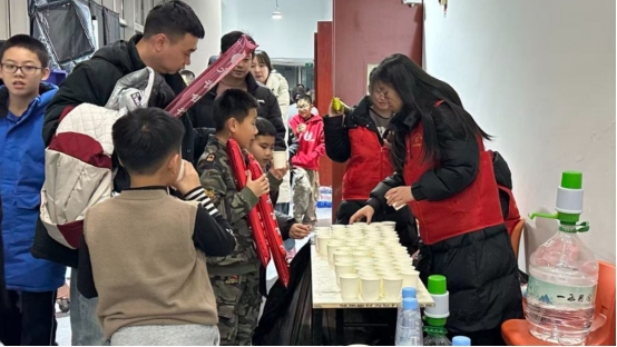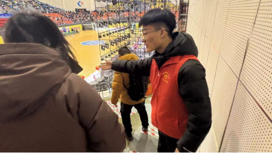 活动现场,志愿者们分工协作,热情饱满,迅速投入到各个岗位。在赛场入口,志愿者化身“暖心接待员”,有条不紊地查验门票,疏导人流,并发放赛事手册与应援道具,提前点燃观赛热情。观众进场后,志愿者变身“贴心引导员”,身穿红马甲穿梭在人群中,耐心指引座位。赛场外的饮水服务区,志愿者们时刻待命,热情引导观众有序接水。他们以严谨细致,务实笃行的服务准则,让青春在躬身奉献中绽放别样光彩。