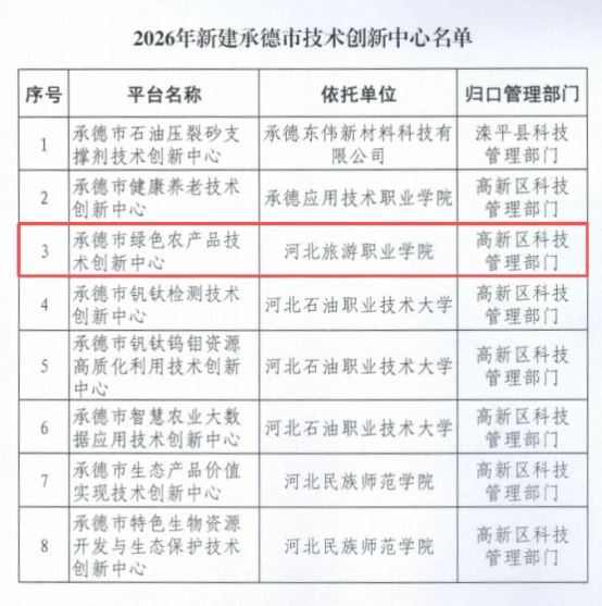 近日,承德市科学技术局正式印发《关于公布2026年新建承德市技术创新中心名单的通知》,我校牵头申报的“承德市绿色农产品技术创新中心”成功获批,成为2026年新建8家市级技术创新中心之一,标志着我校在服务区域绿色农产品产业高质量发展、科研平台建设方面取得重要进展。