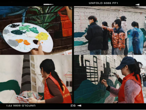 以行践诺,丹心淬炼青春担当。绘制期间,志愿者们文明施工、轻声作业,主动与居民交流创作思路,耐心讲解画面背后的环保理念。从设计到施工,从晨光到暮色,师生志愿者们克服天气变化、高强度作业等困难,用汗水浇灌创意,用热爱点亮社区。墙面处理阶段,志愿者们细心铲除老旧墙皮,一遍遍打磨、刷底、上漆,为创作筑牢基底。绘制过程中,专业教师巡回指导,百余名学生分工协作,起形、调色、上色、精修,每一个环节都精益求精。墙面上最终定格的,是绿水青山的生态画卷;画笔下流淌的,是志愿服务的青春热忱;社区里回响的,是雷锋精神在新时代的动人乐章。