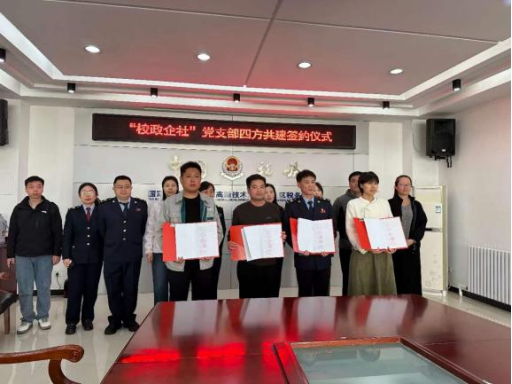 签约仪式上,四位党支部书记在分别介绍本单位和本支部特色与亮点工作后,围绕责权划分、合作形式、重点领域等核心内容深入研讨,就“人才共育、科研共研、基层共治、产业共兴”的建设目标与“机制共建、理论共学、组织共促、资源共享、人才共育、项目共抓、活动共办、品牌共创”的建设途径达成共识,同时也就如何在四方共建中提升学生就业创业能力提出可行方案。随后,四方代表郑重签署共建协议,标志着“校政企社”协同育人工作正式落地,开启了多方携手、同向发力、共促发展的党建新格局。